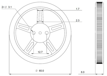 Cette roue de diamètre 60 mm avec pneu cranté est spécialement conçue pour les servomoteur miniatures à rotation continue de chez FEETECH ou compatible.
