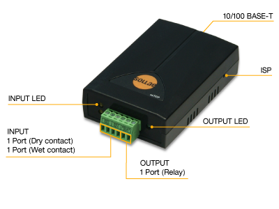 Le boitier CIE-H12A est une passerelle d'entrées/sortie distantes équipée de 2 ports d'entrée tout-ou-rien (opto-couplés) et d'un port de sortie sur relais. Le premier port d'entrée est destiné à détecter l'ouverture/fermeture d'un contact sec. Le second port d'entrée est destiné à détecter l'apparition/disparition d'une tension (24 Vcc max.).