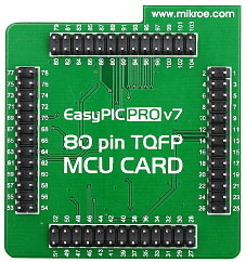 Cette platine est destinée de base à être insérée sur une carte de développement "EasyPIC PRO v7" mais vous pourrez aussi l'utiliser sur vos propres montages (nous proposons en option ci-dessous les barettes femelles). Elle intègre un PIC18F8722 au format TQFP 80 broches (100 mil) pré-soudé avec quartz et autre composants sur laquelle les différentes broches du PIC sont récupérables au pas de 2,54 mm sur 4 barettes mâles double rangées (2 x 13 broches) au dos du module.