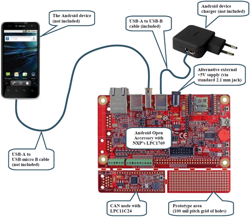 La platine "Android Open accessory application" est conçue pour l'évaluation et le développement de périphériques pilotables par les dispositifs équipés d'un système d'exploitation Android™ (téléphone portable ou tablette PC).