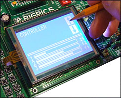 Mais également de la présence d'un connecteur spécial capable de recevoir une dalle tactile optionnelle, laquelle devra être aposée sur l'afficheur graphique 128 x 64 optionnel. Dès lors, il vous sera possible à l'aide d'un des compilateurs optionnels proposés ci-dessous de piloter la dalle très facilement et simplement. Vous disposez également d'un circuit d'extension de port et d'un pavé directionnel (flèches + validation).