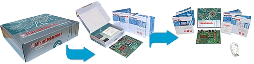 Le starter-kit est livré avec les compilateurs BASIC (MikroBASIC), "C" (MikroC) et "Pascal" (MikroPASCAL) en versions de démo (exploitables mais limités à 2 Ko) - les versions sans limitations sont disponibles en option au bas de la page. Une quantité impressionnante d'exemples de programmes pour ces langages (ainsi que des exemples en assembleur) sont également disponibles afin de vous assurer une prise en main immédiate en vous permettant ainsi de tester, d'étudier et de communiquer avec la plupart des périphériques que vous pourrez rencontrer dans les applications industrielles: afficheurs LCD, graphiques ou 7 segments, claviers de saisie, claviers de PC, affichage par Led, communication série, communication USB, mesure et contrôle de température, conversion analogique / numérique, etc, etc...