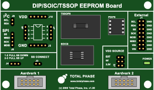 La platine permetta ainsi de programmer les mémoire série EEprom à bus I2C™ et SPI™ en boîtier DIP8, SOIC8 ou TSSOP8 (grâce aux divers supports présents sur la platine).