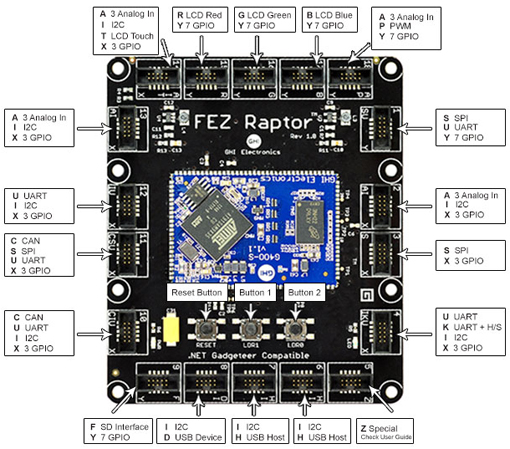 Détail des connecteurs de la platine "FEZ Raptor".