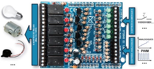 Livrée montée, cette platine Shield pour Arduino® est équipée de 6 entrées analogiques, de 6 entrée tout-ou-rien et de 6 sorties relais. Elle est idéale pour piloter divers dispositifs (petits moteur, buzzer, sirènes, lampes, etc...).