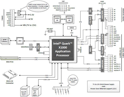 Mais ce n'est pas tout, la platine "Galileo Gen2" dispose en natif d'une multitude d'E/S au "standard PC", ainsi elle est équipée d'un slot mini-PCI Express, d'un port Ethernet 100Mb, d'un connecteur pour microSD™ (carte mémoire non incluse), d'un port RS-232, de ports USB (Host et Device) et de 8 MB de mémoire Flash.