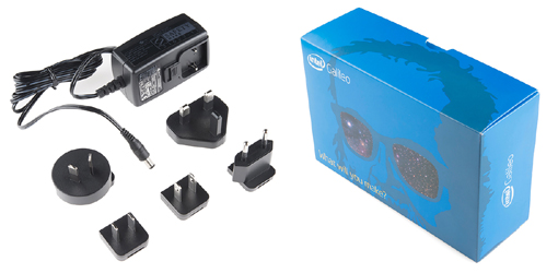 La platine Intel Galileo est livrée avec une boîte de rangement et un bloc d'alimentation universel.