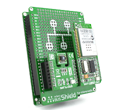 La photo ci-dessous montre un exemple d'utilisation d'un module "click Board" Wifi et d'un module "click Board" capteur d'humidité raccordé au dos d'un afficheur mikromedia via la platine "mikroBUS Shield".![]()