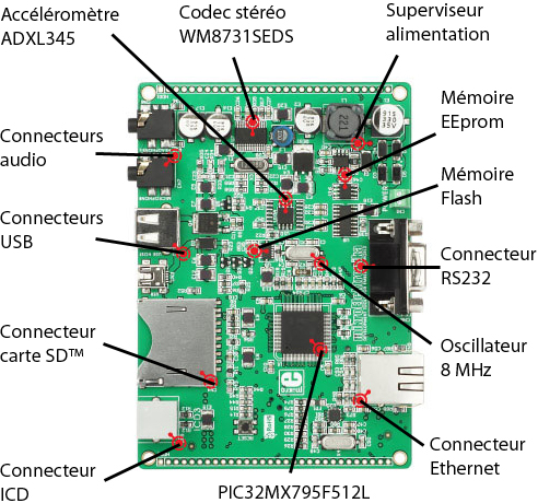 La platine dispose de différents accessoires intégré tels que: Circuit codex stéréo, connecteurs pour case et micro, connecteurs USB (host/device), mémoire Flash, mémoire EEPROM, étage de régulation, port série, port Ethernet, capteur de température, connecteur pour carte mémoire SD™ (la carte n'est pas livrée), accéléromètre, Leds de visualisation, mini-joystick, etc...