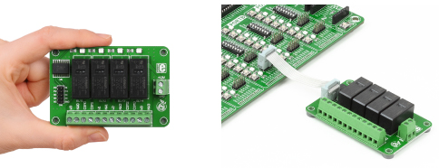 Les entrées de commande sont accessibles via un connecteur HE10 mâle. L'état des relais est indépendamment visualisable via 4 Leds. Les contacts des relais sont accessibles via des borniers à vis.