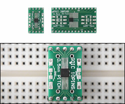 Cet petit circuit imprimé composé de 2 zones adaptatrices "SOIC/DIL" seccables permet de souder des composants 10 ou 28 broches aux pas de 0,5 mm. Elle dispose également d'emplacements CMS additionnels au format 0805 (cendensateur par exemple).