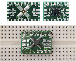 Cet petit circuit imprimé composé de 2 zones adaptatrices "QFN/QFP" seccables permet de souder des composants 16 ou 20 broches aux pas de 0,5 mm. Elle dispose également d'emplacements CMS additionnels au format 0805 (comme des cendensateurs par exemple).
