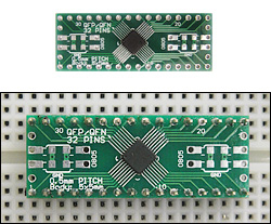 Ce petit circuit imprimé peut recevoir des composants au format "QFN" ou "QFP" 32 broches au pas de 0,5 mm. Elle dispose également d'emplacements CMS additionnels au format 0805 (comme des condensateurs par exemple).