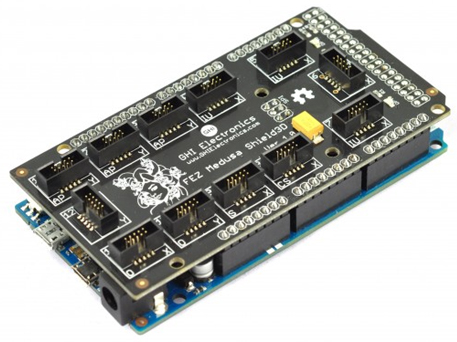 Cette platine Shield (livrée seule) est spécialement conçue pour venir s'enficher sur votre carte Arduino Mega 2560, Mega ADK ou DUE. Elle vous permettra de récupérer tous les port E/S de votre module Arduino sur 12 connecteurs au format Gadgeteer afin d'y brancher les modules de la gamme FEZ.