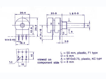 Potentiomètres linéaires rotatifs stéréo (sans interrupteur) de 20mm avec piste de carbone pour applications CI. Boîtier métallique et axe en plastique (Ø 6mm).