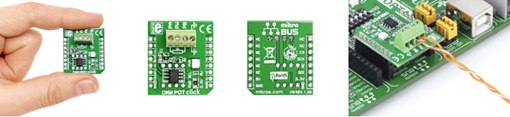 Equipé d'un circuit intégré spécialisé MCP41010, ce module Click Board s'apparente à un potentiomètre numérique (d'une valeur de 10 k). Doté d'une résolution de conversion sur 8 bits, il s'adresse et se pilote via une communication SPI™.