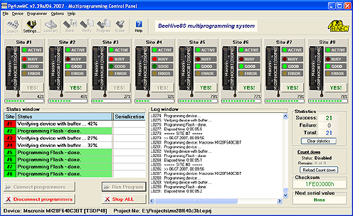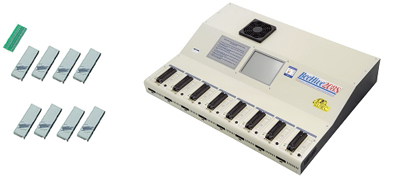 Bénéficiant d'une garantie de 3 ans, le "BeeHive208S" est un programmateur universel multi-supports totalement autonome. Extrêmement rapide et spécialement conçu pour les chaînes de production, il est dôté de 8 supports ZIF 48 broches indépendants. Conçu sur une base PC (avec sys-tème Windows XP™ embarqué), il est capable de supporter près de composants (EPROM, EEPROM, FLASH Eprom, PROM, micro-contrôleurs divers, PLD...).
