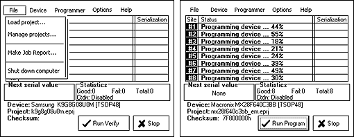 La gestion de ses 8 supports est asynchrone de telle sorte que chaque support puisse débuter la programmation de son composant au moment où il aura détecté son insertion (et ce indépendamment de l'état des autres supports). Dès lors, 7 supports pourront être en phase de programmation alors que vous retirez le composant dont la programmation vien de s'achever sur le huitième support ! Vous pourrez également programmer des composants de nature différentes sur chaque support (un microcontrôleur sur le premier support, une Eprom sur le second, etc...).