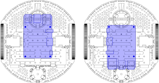 A noter que le châssis dispose de trous de fixation permettant de monter une platine Arduino UNO (non inclus) ou une platine Raspberry Pi (non inclus) à l'aide d'entretoises 11 mm minimum (non livrées) ainsi que d'une interface de puissance complémentaire (disponible en option) qui sera toutefois nécessaire pour piloter les moteurs du châssis.