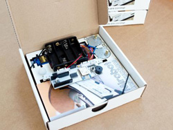 Ce robot s'assemble très simplement (aucune soudure, ni outil ne sont nécessaires). Il est équipé de 2 moteurs pas-à-pas et d'un servomoteur (prévoir un slylo non inclus).