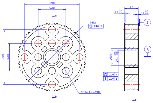 Jeu de 4 roues crantées en plastique avec 62 dents. Trou central de diamètre 8 mm. Compatibles avec les courroies crantées MXL et les chenilles à gomme Makeblock.