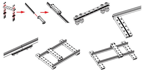 Exemple de nombreuses possibilités de combinaisons possibles, dont la réalisation de rails de guidage pour parties mobiles (certaines pièces représentées ne sont pas livrées avec la référence de cette page).