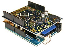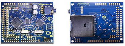 Ce shield est conçu pour pouvoir s'enficher sur une carte arduino® (prévoir connecteur en sus à souder) afin que cette dernière puisse (par le biais d'ordres séries) restituer des fichiers "MP3" préalablement stockés sur une carte SD™/MMC™.