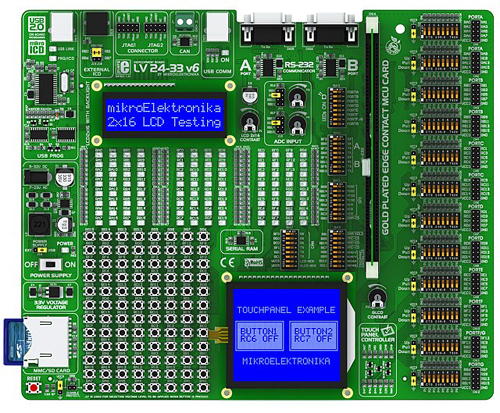 La platine peut recevoir des modules avec microcontrôleurs basse tension alimentés en +3,3 V avec 64, 80 et 100 broches de type PIC24F / 24 / dsPIC33F. Un afficheur graphique 128 x 64 pixels (avec ou sans dalle tactile) peu également être ajouté en option à la platine.