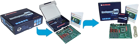 Le starter-kit est livré avec les compilateurs BASIC (MikroBASIC), "C" (MikroC) et "Pascal" (MikroPASCAL) en versions de démo (exploitables mais limités à 2 Ko). Une quantité impressionnante d'exemples de programmes pour ces langages (ainsi que des exemples en assembleur) sont également disponibles afin de vous assurer une prise en main immédiate en vous permettant ainsi de tester, d'étudier et de communiquer avec la plupart des périphériques que vous pourrez rencontrer dans les applications industrielles: afficheurs LCD, graphiques, claviers de saisie, claviers de PC, affichage par Led, communication série, communication USB, mesure et contrôle de température, conversion analogique / numérique, etc, etc...