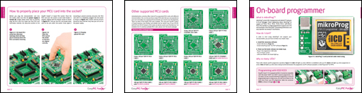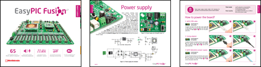 Comportant 36 pages entièrement en couleur, la documentation du starter kit "EasyPIC Fusion™ v7" explique pas-à-pas (à l’aide de nombreuses illustrations et schémas théoriques) comment configurer la platine vis-à-vis du PIC® que vous souhaitez exploiter, comment utiliser le programmateur et le débugger ainsi que les différents périphériques intégrés ou optionnels.