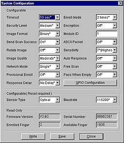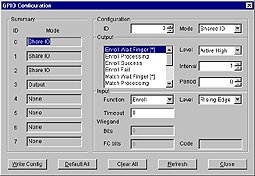 Le programme permet également de modifier les nombreux paramètres de configuration du module: vitesse de communication, degré de sécurité, nombre de lecture d'une empreinte avant mémorisation, configuration et attribution du rôle des 8 entrées/sorties, etc, etc...![]() |