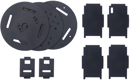 Le plateau circulaire dispose d'une encoche destinée à recevoir le palonier du servomoteur (non livré) ainsi que de différents trous de fixation destinés à recevoir le dispositif à placer sur la tourelle (caméra, capteur, etc...).