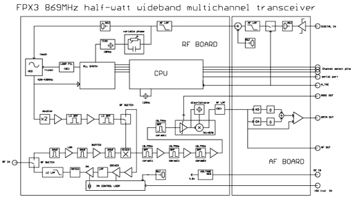 Ce module est un transceiver 869 MHz "FM" 400 mW large bande synthétisé (8 canaux) intégrant dans le même boîtier un émetteur et un récepteur permettant une transmission bi-directionnelle. Débit max: 10 Kbps - Portée: 3 Km.