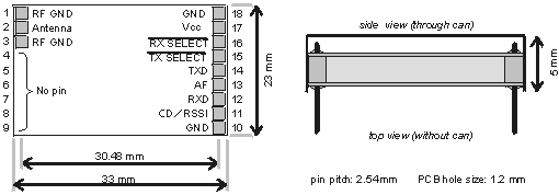 Ces modules sont des transceivers radiofréquences "FM" 433,92 MHz large bande intégrant dans le même boîtier un émetteur et un récepteur permettant une transmission bi-directionnelle. Débit max: 10 ou 64 Kbps - Portée: 300 m.