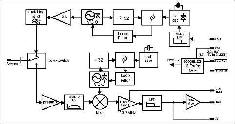 La partie émission des modules "BiM2A-433" est stabilisée par un étage PLL contrôlé par un quartz. L'entrée "TXD" de l'émetteur accepte à la fois les données numériques (0 - 1) ainsi que les signaux analogiques.