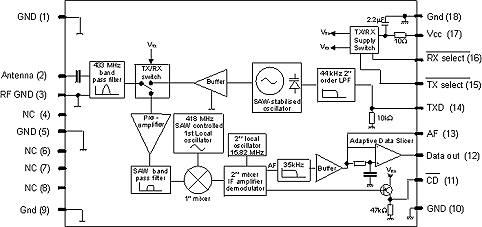 La partie émission des modules "BiM2-433-160" est stabilisée par un résonateur à onde de surface (SAW). L'entrée "TXD" de l'émetteur accepte à la fois les données numériques (0 - 1) ainsi que les signaux analogiques.